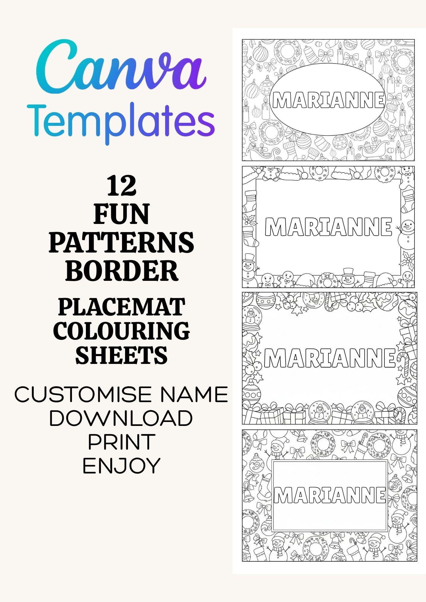 Christmas Name Placemat Colouring Sheets – 12 Fun Pattern Borders | Editable Canva Template
