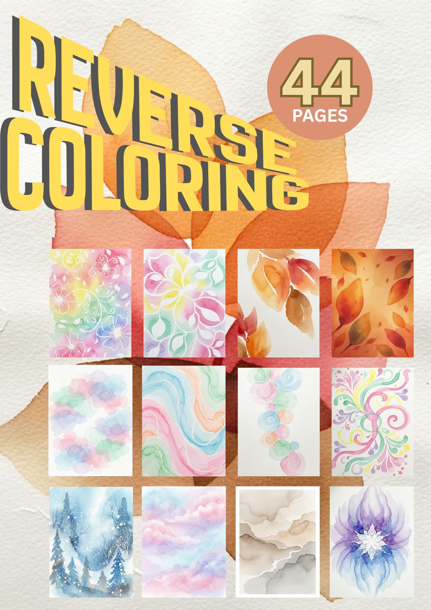 44 Reverse Coloring Pages – Watercolor Abstract Backgrounds (Instant Download