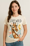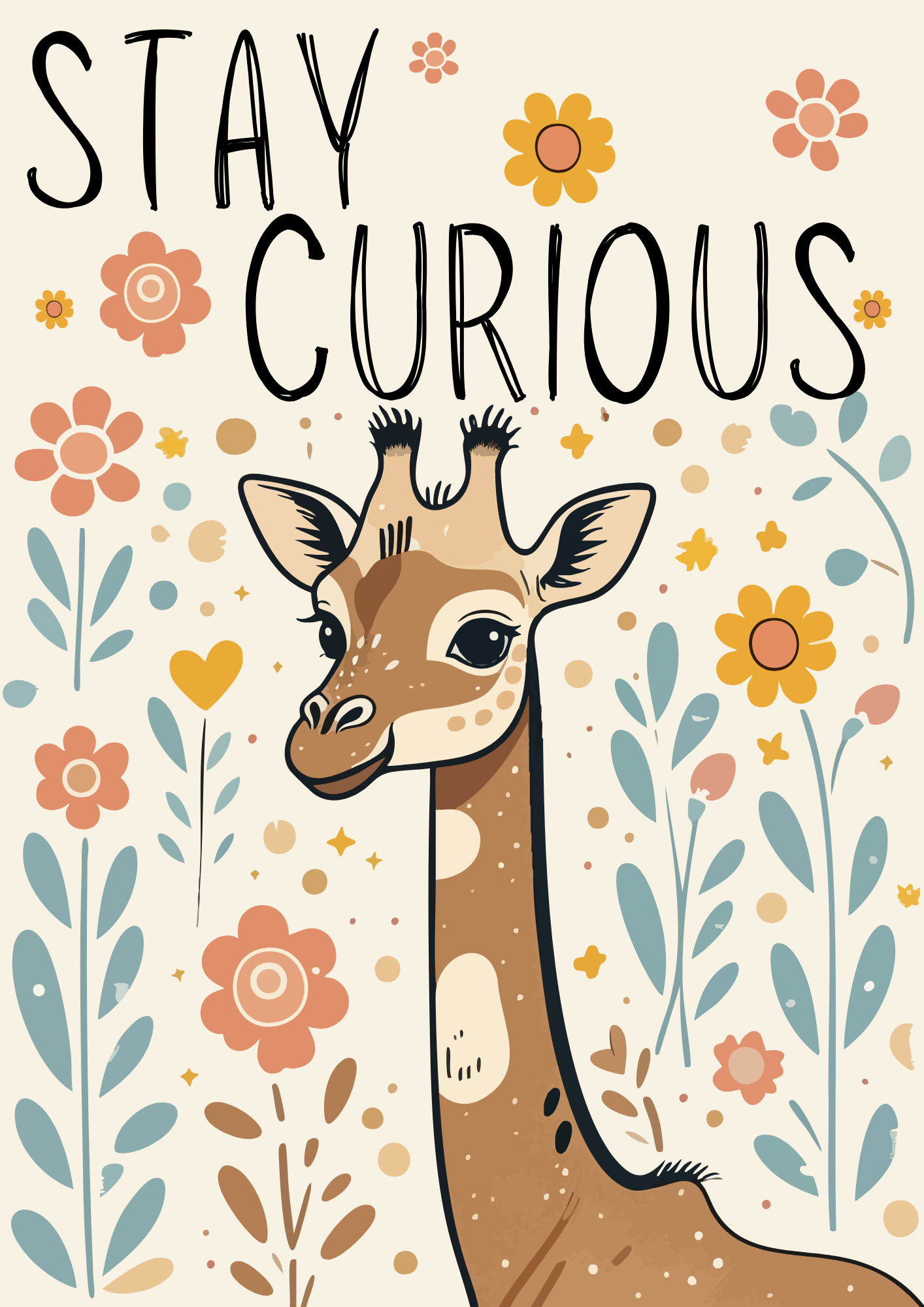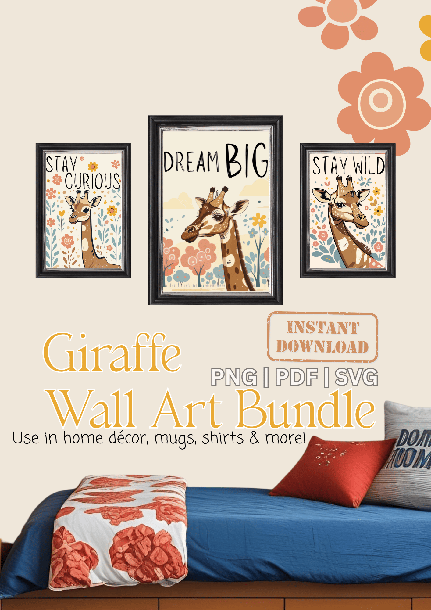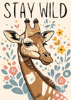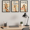 Each print showcases a unique giraffe personality paired with a motivational message — Stay Wild, Stay Curious, and Dream Big — making it perfect for both kids and grown-ups. With its soft, earthy tones and modern boho aesthetic, it fits seamlessly into nurseries, classrooms, creative studios, or home offices.