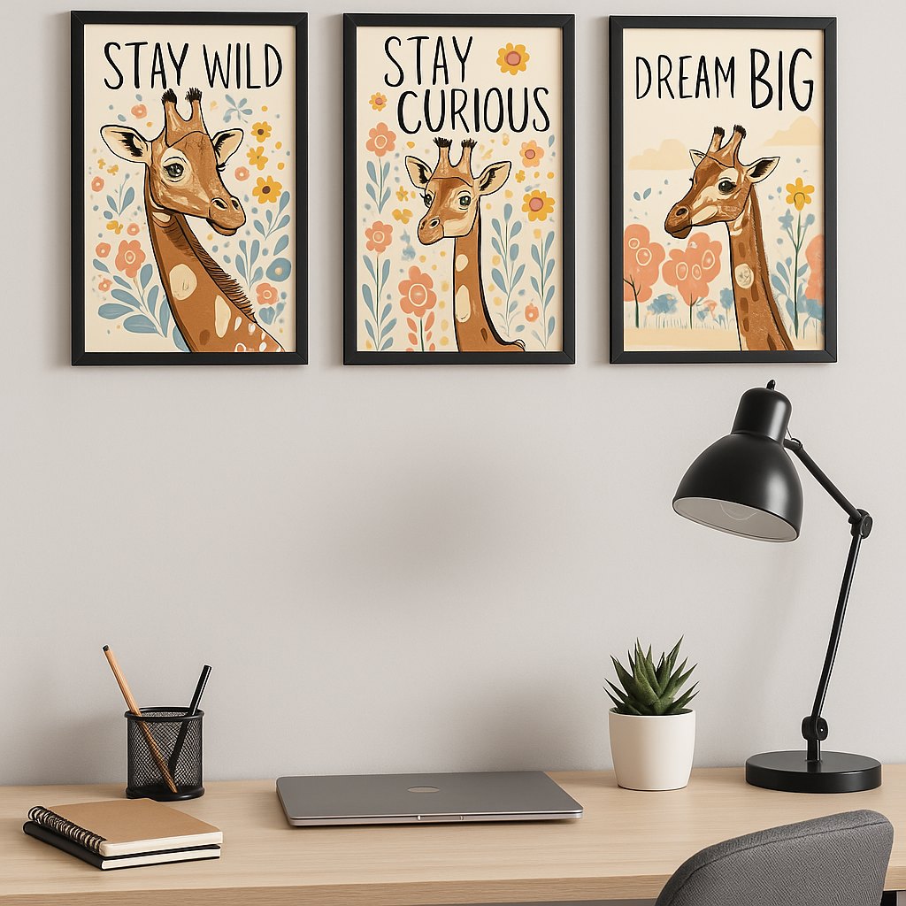 Add playful charm to your space with this hand-illustrated giraffe art set. Perfect for home offices, creative spaces, or as a gift!